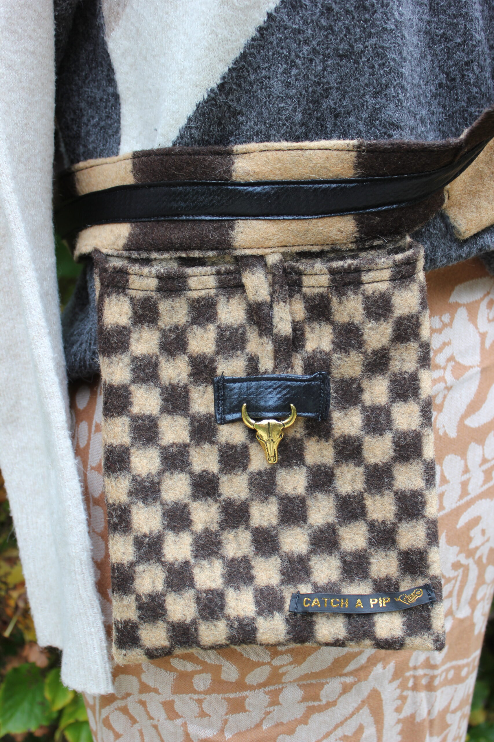 Dit unieke ‘Block Chain’ ontwerp kan zowel als tas gedragen worden en/of als taille ceintuur. Als taille riem strak aangetrokken om je middel om een kledingstuk te verfraaien of als schouder en/of heuptas. Draag het cross body met je tas laag of hoog of losjes om je heup. Je kunt de tas zo plaatsen hoe jij het wil stylen op dat moment. Het ontwerp is gemaakt van een gebreide wollen stof 80% Polyester & 20% Wol. Er loopt is de gehele breedte een zwarte baisse band over die de stof ook zijn stevigheid geeft. De band is extra lang zodat je er zelf mee kunt spelen hoe het te dragen. De draagband/ceintuur is verstelbaar middels een bronzen/goudkleurige passeerschuif. Heb je teveel band over, dan vouw je er eenvoudig een slappe knoop in. Het aanhangende tasje heeft als sluiting een prachtige bronzen gestileerde stierenkop waarbij de horens gehaakt achter de zwarte lus voor de sluiting zorgen. Het ruche gedeelte op de draagband geeft het haar speelse karakter. Als taille riem gedragen kan het tot minimaal 82 cm versteld worden. De maximale stoflengte wollenband is 125,0 cm met daarbij nog een verlenging van 44,0 cm zwart baisse band (totale lengte 1.69m.) Bandbreedte ruche gedeelte is 12,5 cm , bandbreedte recht deel stof is 6,0 cm. Tasje is B: 18,0 cm x H: 21,5 cm. Een handige accessoire om je kleding leuk mee te stylen en je tasje meteen bij de hand. Dit is ook erg leuk te dragen over een jas.