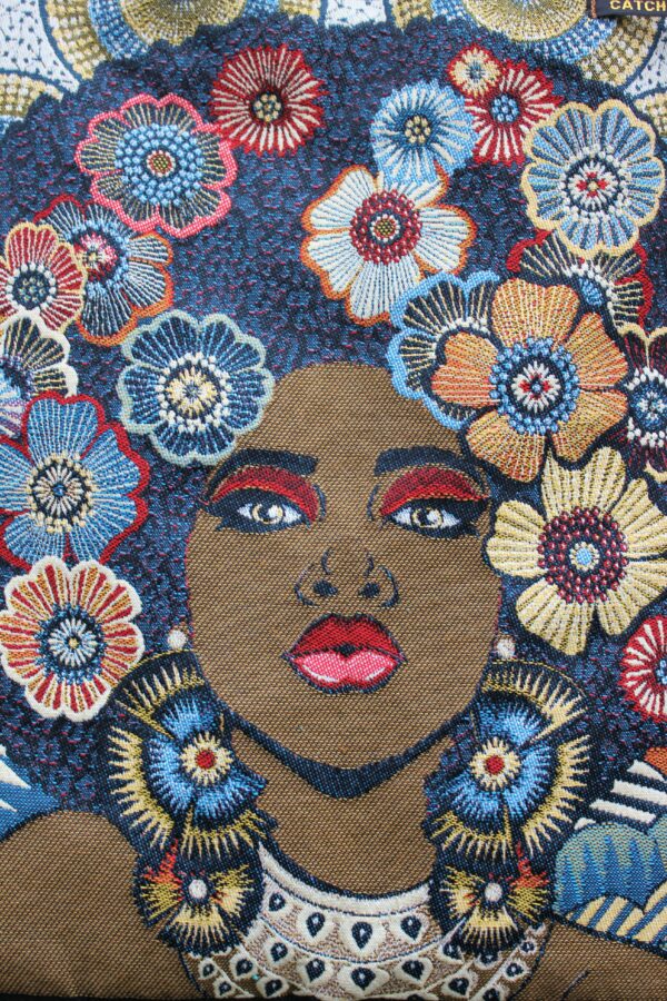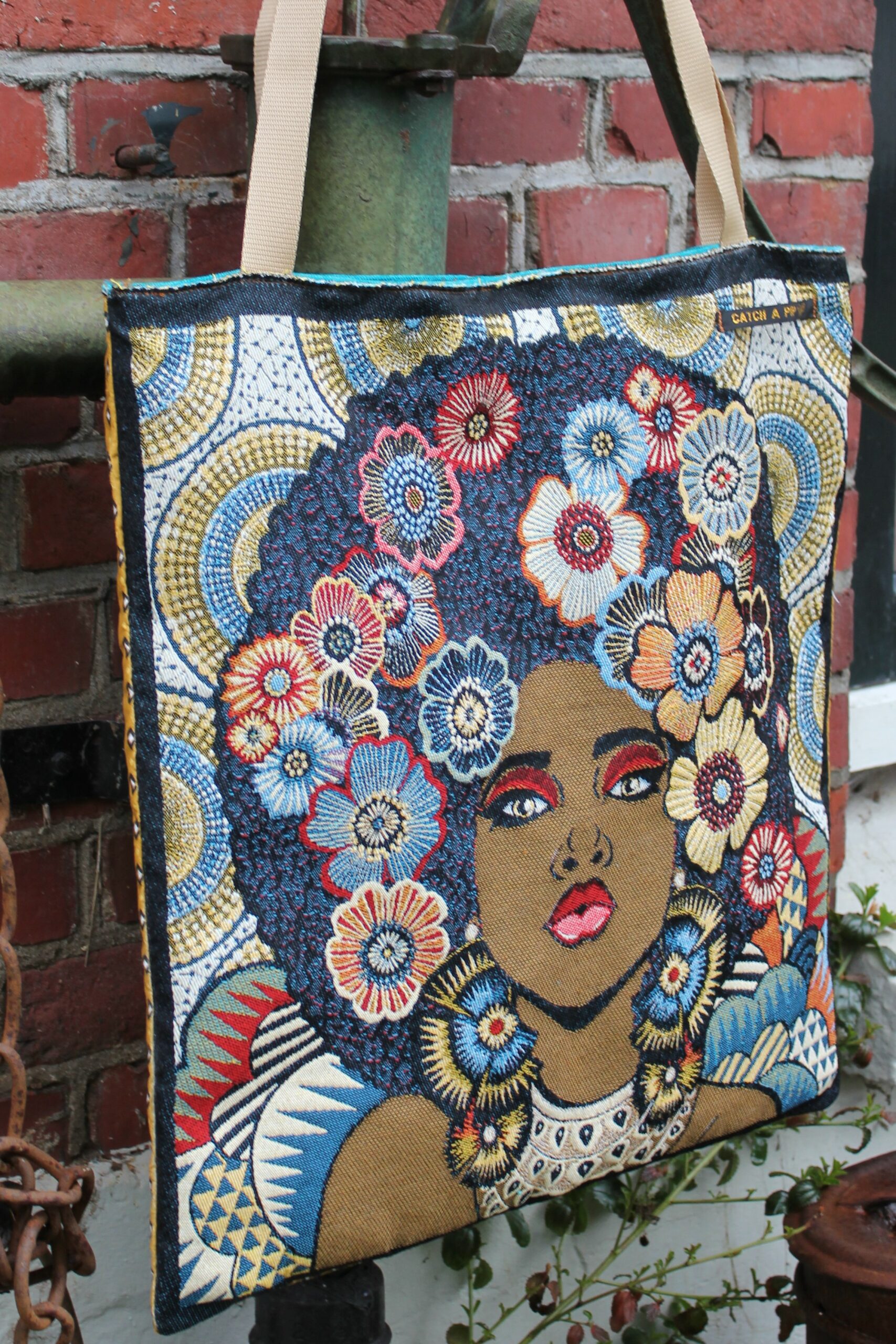 Lekkere Big Shopper met een 60’s feel. Deze tas is gemaakt van een stevige Paneelstof met print op de voorkant en achter met een katoenen stof met okerkleur print. Geheel gevoerd met zware Turquoise velours stof en bevat 2 grote vakken. Ritsvak met bronzen rits, B: 30,0 cm cm x H: 38,0 cm. Vak B: 28,0 cm x H: 37,0 cm. Heeft stevige licht goudkleurige banden, 69,o cm. Tas sluit af met een bronzen magneetknoop. Tas grootte B: 45,0 cm x H: 47,5 cm. Prachtige tas die multifunctioneel is! Denk b.v aan je boodschappen, dagje strand, werk-/schoolspullen. Een mooi eerbetoon aan de Flower Power! En ook weer helemaal van deze tijd!