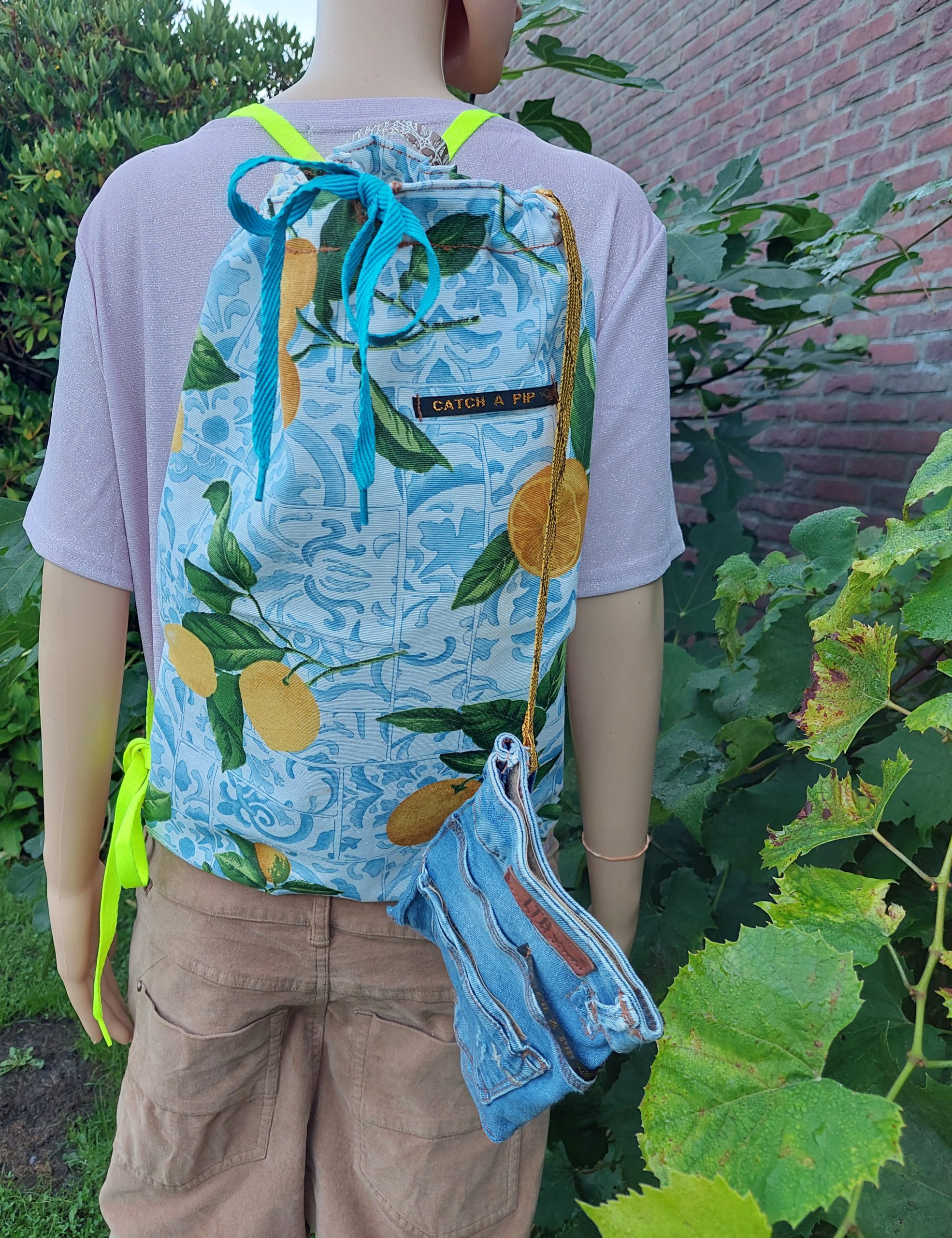 ‘IF LIFE GIVES YOU LEMONS’ is een handig klein rugzakje gemaakt voor mijzelf. Gemaakt van een canvas stof met Citroenenprint erop, geheel gevoerd met transparant PVC en dus waterdicht. Met een handig bijtasje gemaakt van re-used jeans met vele vakjes die afsluitbaar zijn met klittenband. De neon gele draagbanden zijn verstelbaar. Een gemakkelijk en praktisch klein rugzakje voor op de fiets of aan de wandel. NOT FOR SALE!