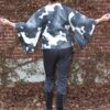 Deze korte KOEle Blouse is gemaakt van een velours stof met levensechte koeienprint welke zacht aanvoelt. Is ongevoerd en heeft een splitje aan beide zijden onderaan. Driekwart wijde mouw en royale fit. Detail van goudkleurige Stierenkop. Deze blouse draagt aangenaam en kun je zowel gekleed als mooi op een jeans dragen voor een stoerdere look. Bij wat frisser weer, kun je er ook prima een T-shirt met lange mouw onder dragen. Model is 1.72 m. Geschikt voor maten M,L,XL . Zie voor afmetingen foto. Meten is weten. Bij vragen stuur mij een mail op catchapip@gmail.com Ik help je graag verder.