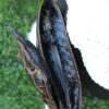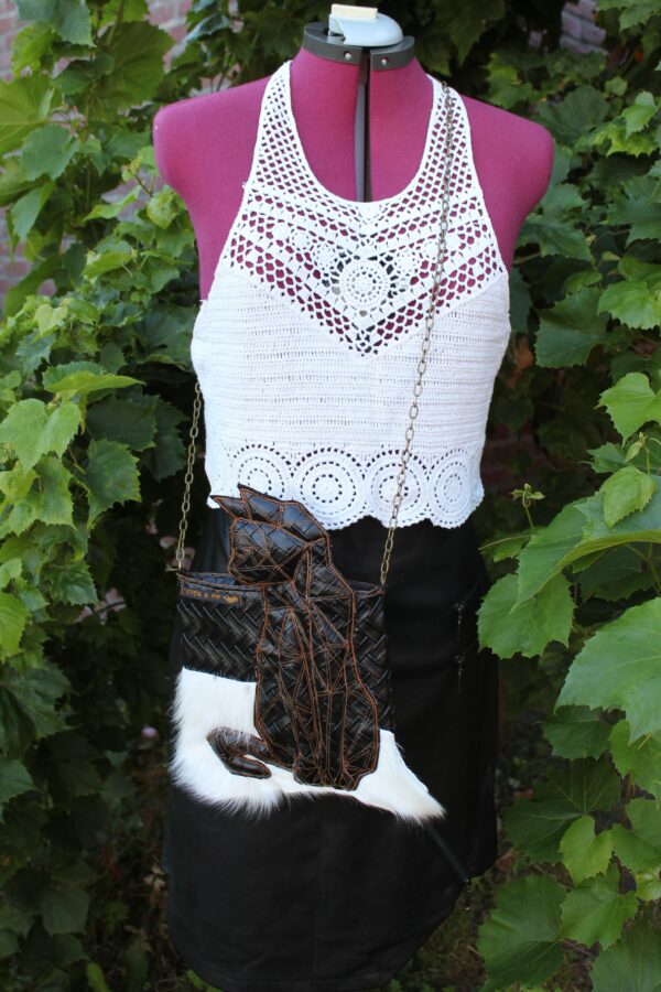 ‘MIAUW’ is een bijzonder vormgegeven schoudertas gemaakt van zwart gevlochten kunstleer en wit geitenvacht. Op het vachtje zit een handgemaakte applicatie van een Poes. Niet alleen voor de kattenliefhebber, maar het is ook een mooi statement piece om aan je zijde te hebben. De tas is geheel gevoerd met een snakeprint kunststof leer en heeft vakken. Sluit in haar geheel af met een bronzen rits en heeft een bronzen Jasseron ketting als draagband (120,0 cm). Tas is B: 21,5 cm x H: 23,0 cm. Twee vakken zijn B: 21,0 cm x H: 18,0 cm. Deze lieverd zoekt nog een gouden mandje. Zeg jij ‘MIAUW’?….