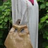 Deze unieke vormgegeven hand-/schoudertas is gemaakt van een prachtige kunstleren stof met slangenprint in goud/bruin. De stilistische uitgewerkte vorm heeft wat weg van een uil. De driehoeken zijn opgevuld voor extra reliëf, zowel op de tas zelf als in de handvaten. De handvaten zitten aan elkaar vast middels bronzen magneetknopen zodat ze aan elkaar blijven zitten bij gebruik. De tas is in haar geheel afsluitbaar met een bronzen rits. Geheel gevoerd met een donker gouden Taft. Heeft twee vakken en bril-/penlusjes van slangenleer. De tas kan over de schouder gedragen worden middels een bronzen ketting. Extra detail van een bronzen uiltje op de voorkant. Zie maattekening voor de afmetingen.