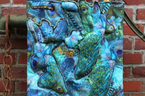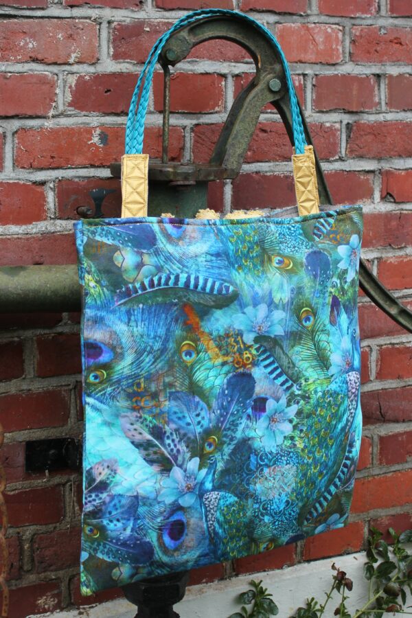 ‘Pauw , Pauw, Pauw….mijn veren zijn mooier dan van jou !’ Deze prachtige medium size shopper is gemaakt van een Tricot Katoen pauwenstof met handgemaakte Pauwenapplicatie. Geheel gevoerd en sluit af met een bronzen magneetknoop. Bevat één ritsvak, B: 25,0 cm x H: 28,0 cm en vak B: 27,0 cm x H: 26,0 cm. De Pauwenapplicaties op de voorkant zijn ook twee kleine vakjes. Hengsels zijn van Turquoise gevlochten kunstleer met Goud 3D lakleer, lengte hengsel 56,5 cm. Tas is B: 36,5 cm x H: 40,0 cm. Met deze tas kun je trots als een Pauw zijn!