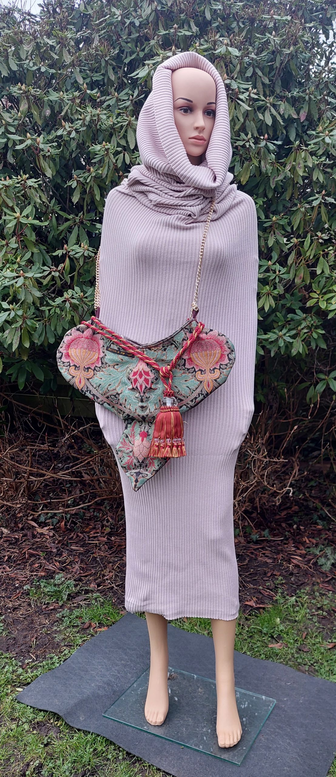‘Persian Fairy Tale’ is een unieke schoudertas gemaakt van een prachtige stevige stof met botanische print aan de voorkant en een kunstleer met reliëf Barok print aan de achterkant. De bijzondere vormgeving accentueert het mooi stofpatroon. Twee bloempatronen zijn licht opgevuld om het patroon extra te benadrukken. Bijzonder detail is de fraaie kwast. Deze kwast is bevestigd met klittenband bandjes en kan er ook afgehaald worden als je daar een keer zin aan hebt. De tas is geheel gevoerd met een mooi stof en heeft twee vakjes en een extra los vakje aan een lint welke sluit met een klittenband. Handig voor je sleutels, portemonnee etc. Lekker veilig en nooit meer graaien onderin je tas. De tas sluit met een bronzen magneetknoop. De tas heeft een goudkleurige metalen ketting die je lang en ingekort kunt dragen. Voor inkorten: Ketting met Hartje kant loskoppelen, door lus halen en verbinden met de andere zijde op jouw te stellen maat. Deze bijzondere tas, met een knipoog naar het oude Perzische rijk, is een sprookjesachtig ontwerp.
