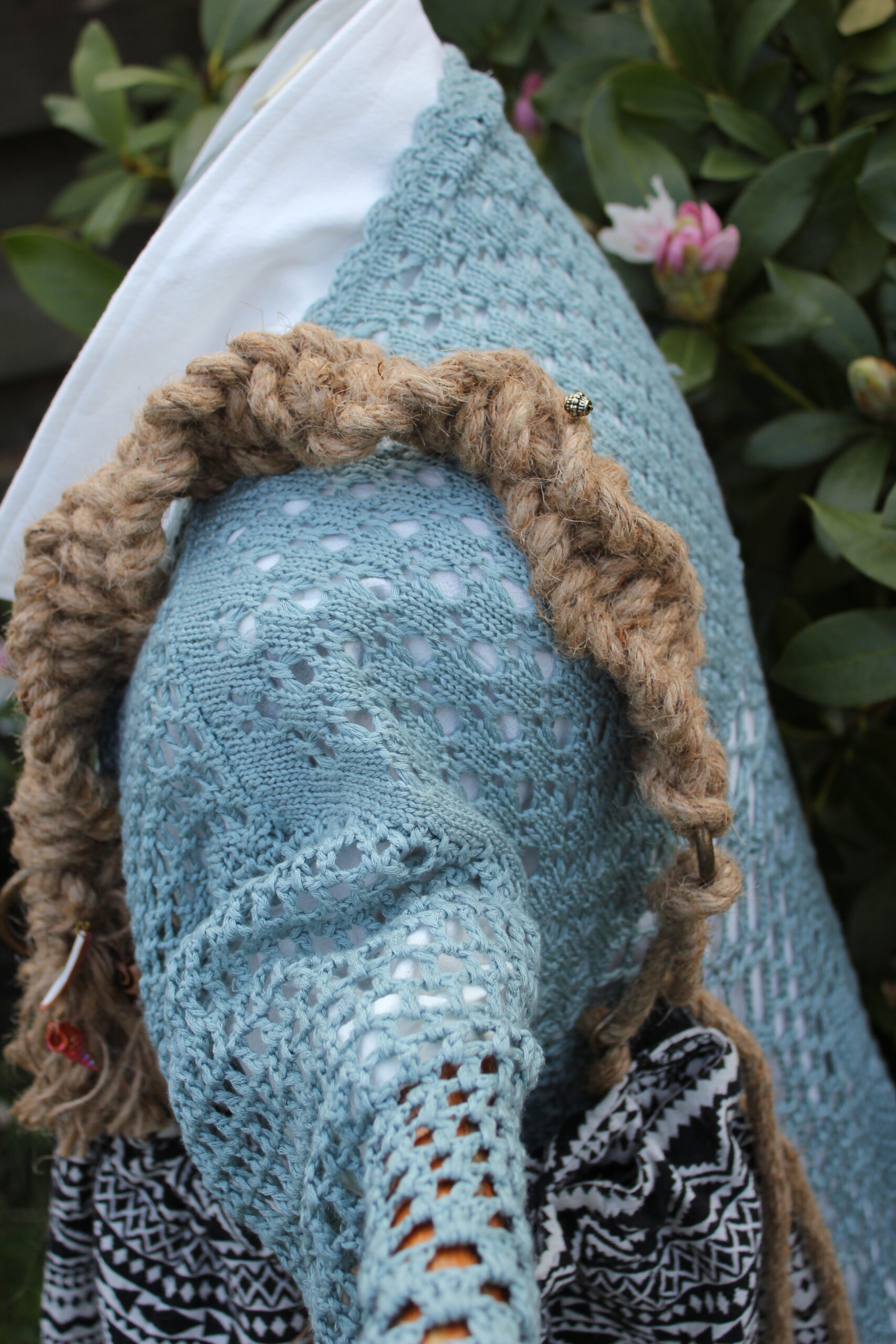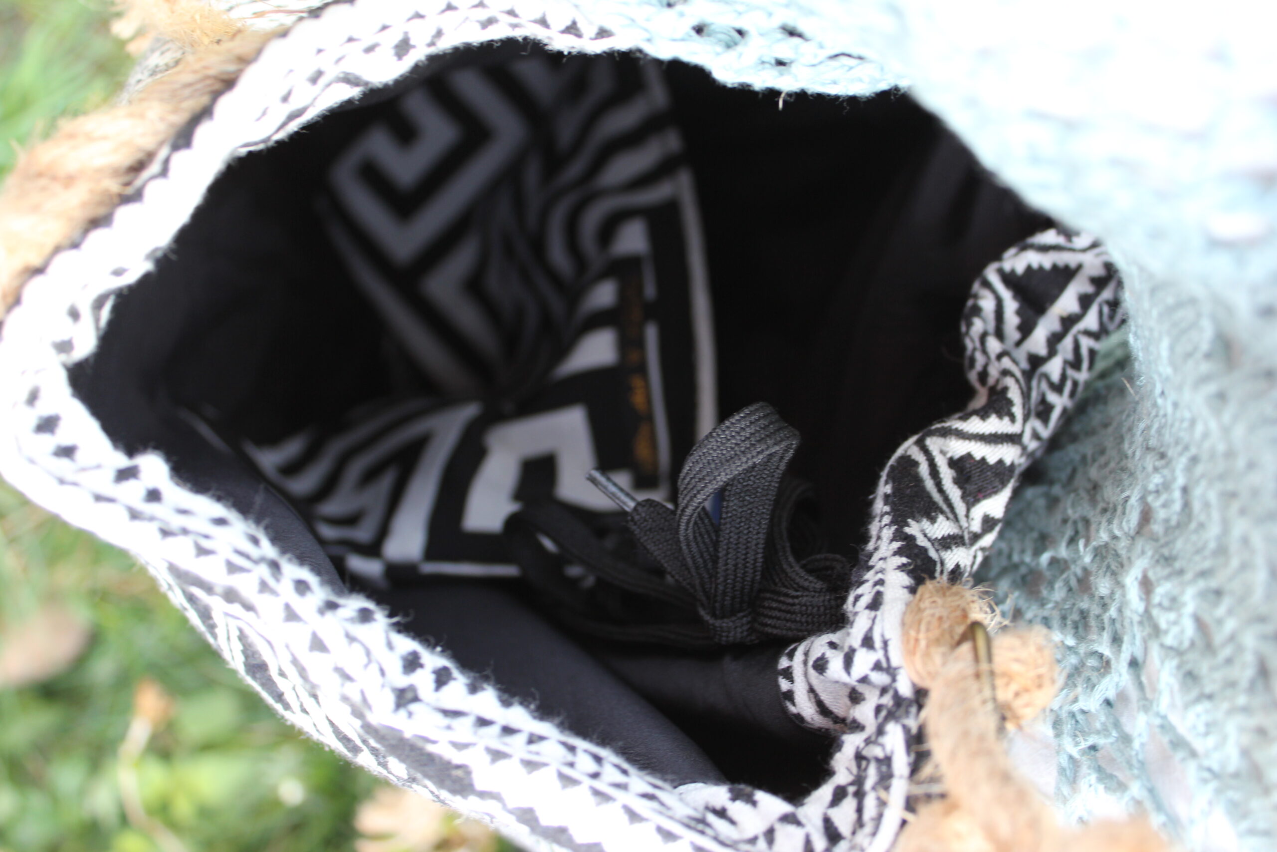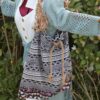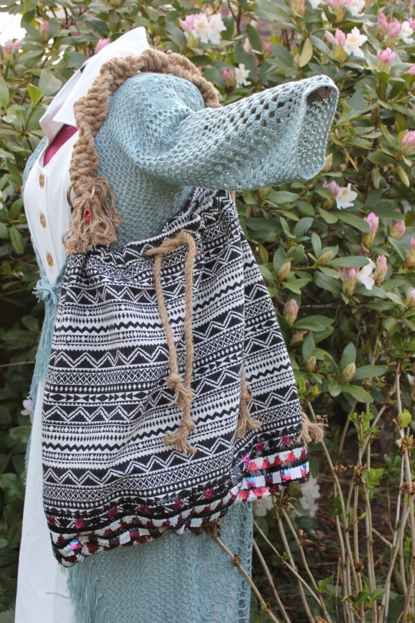 Deze gezellige tas is gemaakt van een re-used zwart/witte stof met mooie pailletten strook. De handgemaakte Macramé schouderband is geïnspireerd op de huisvlijt in de jaren ’70. Deze schouderband heeft leuke details van een slakkenhuiskraal met mooie oud zilveren kraal, parelmoer roze haaientand en metalen hoornschelp aan de kwast en een klein oud zilveren kraaltje bovenop. De Macramé band is bevestigd aan zware bronzen ringen. Deze band is te verlengen met touw middels een bronzen schuifgesp. De tas is geheel afsluitbaar met een touw welke eenvoudig aan te trekken is. De tas heeft een zwarte voering. In de tas hangt een royaal rits tasje aan een veter. Gemaakt van stevig meander zwart/witte canvas stof. Zo vind je makkelijk je kostbaarheden terug. Dit tasje kan er ook uitgehaald worden om los te gebruiken. Ideaal in gebruik en milieuvriendelijk gemaakt van deels hergebruikt materiaal. Voor de grootte, zie de maattekening.