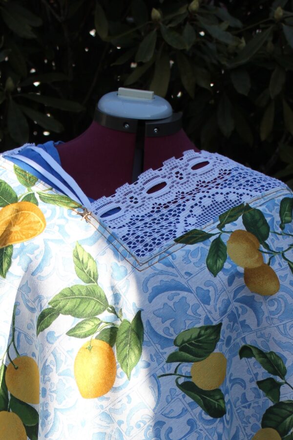 Deze Fris & Fruitige Zonnige Poncho ‘VALENCIA’ is gemaakt van een lichte canvasstof met citroenen op blauw/witte tegels achtergrond. Afgezet met een frivole katoenen franjeband. Achterkant V-hals heeft een stukje wit kant en aan de voorkant ook een asymmetrische strook wit kant aan de linkerzijde. Aan de rechterkant zit ook een klein hoekje wit kant en twee witte zachte bandjes die speels met de halslijn meelopen. Zo blijft de poncho mooi over je schouders hangen. Op de voorkant nog een zomers detail van een goudkleurige metalen Zeester. Dit zonnig kledingstuk is ook ideaal aan het strand, je trekt het zo over je badkleding. Kant bij de hals is ook erg mooi op de blote huid maar met een top of T-shirt eronder ook prachtig. Een heerlijke luchtige poncho die je direct een vakantiegevoel geeft. I.vm. de franjeband is het alleen geschikt voor een handwas en mag niet in de droger. Canvasstof is strijkbaar, franje & kant niet. Ben jij straks het zonnetje deze zomer? Want waar jij loopt, zal jij schijnen! Geschikt voor maat M t/m XL . Zie de maattekening als je het niet zeker weet, of mail mij als je vragen hebt op catchapip@gmail.com Ik help je graag verder. Een PB sturen op FB Catch A Pip kan ook.